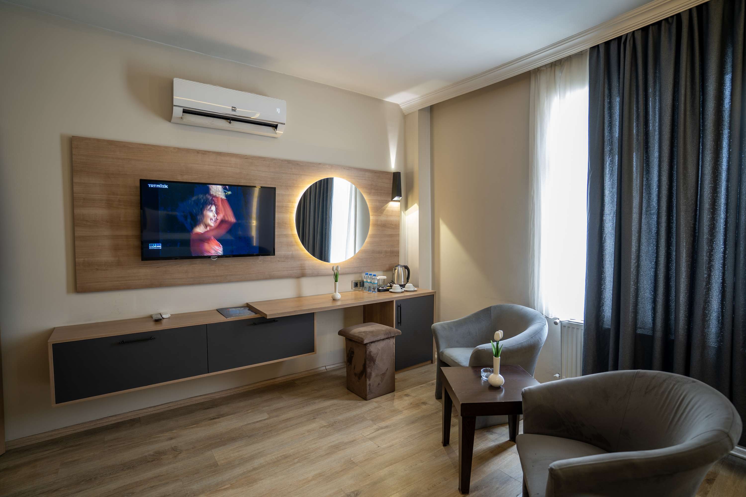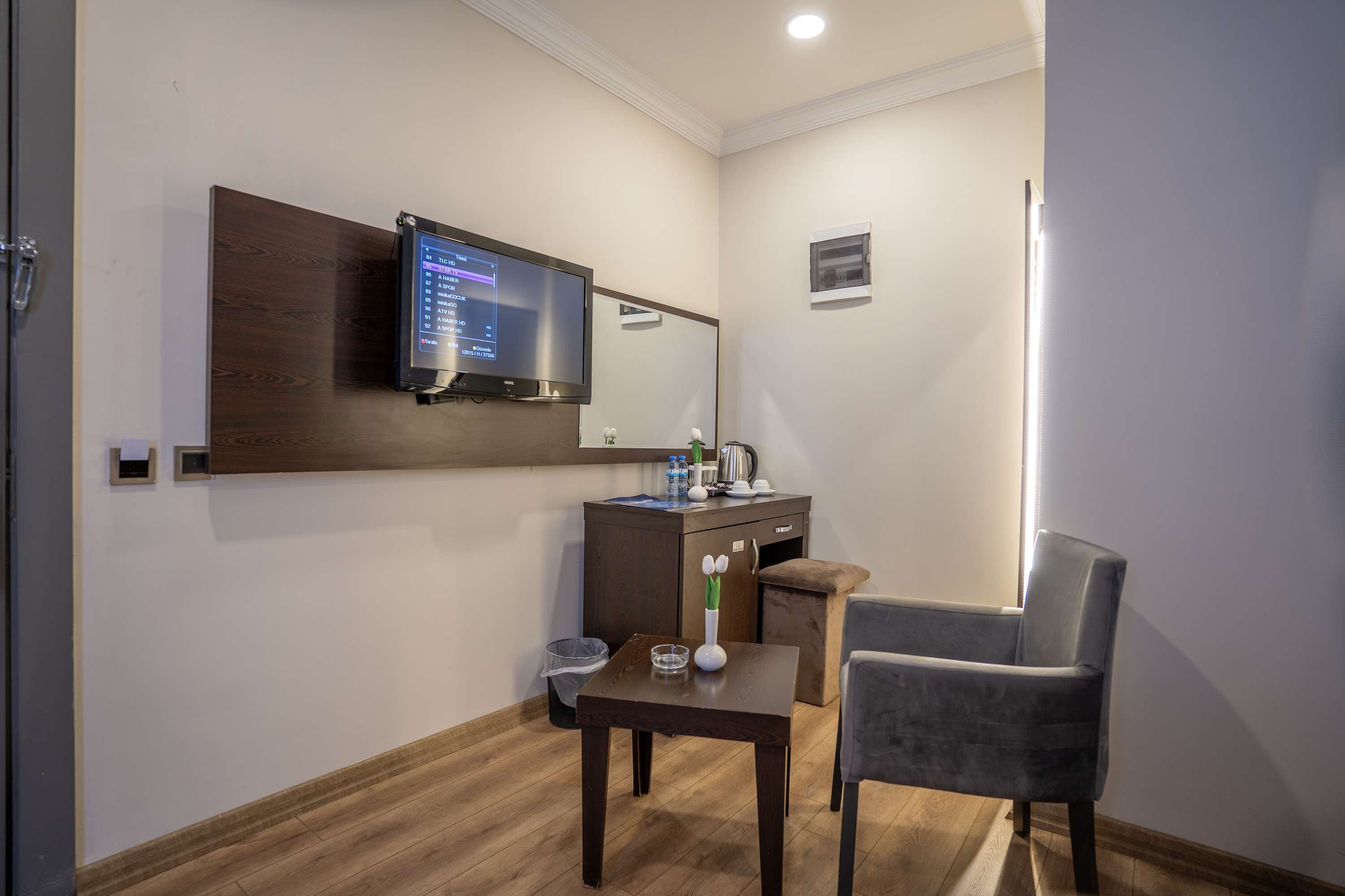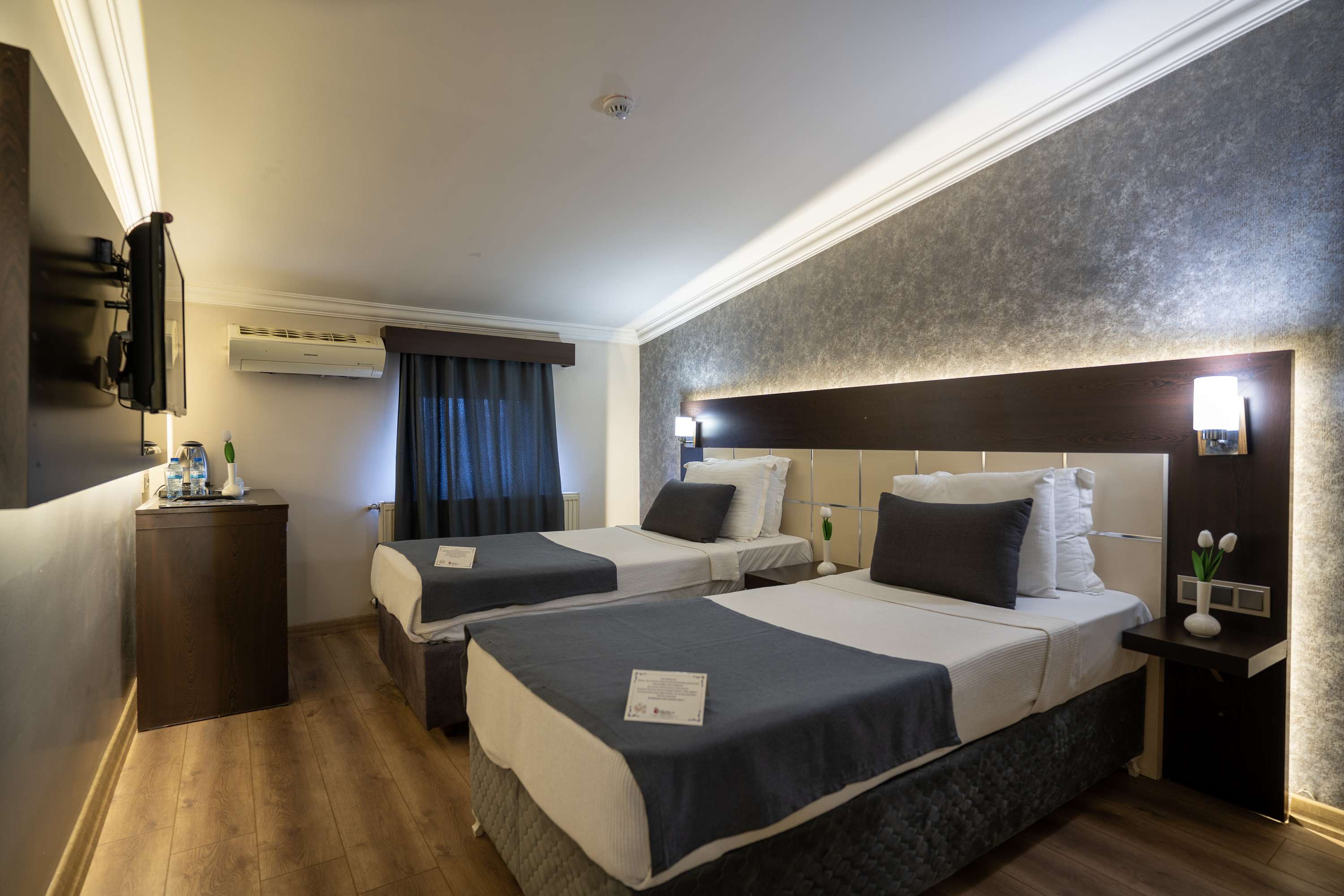 Garni Hotel Twin Room'da iki ayrı tek kişilik yatak, 24 saat sıcak su, TV, minibar, telefon, klima, ısıtma sistemi, güvenlik kasası ve ücretsiz Wi-Fi sunulmaktadır. Parke zeminli odamızın banyosunda WC, duşa kabin, saç kurutma makinesi, telefon, makyaj aynası ve buklet malzemeleri yer almaktadır.