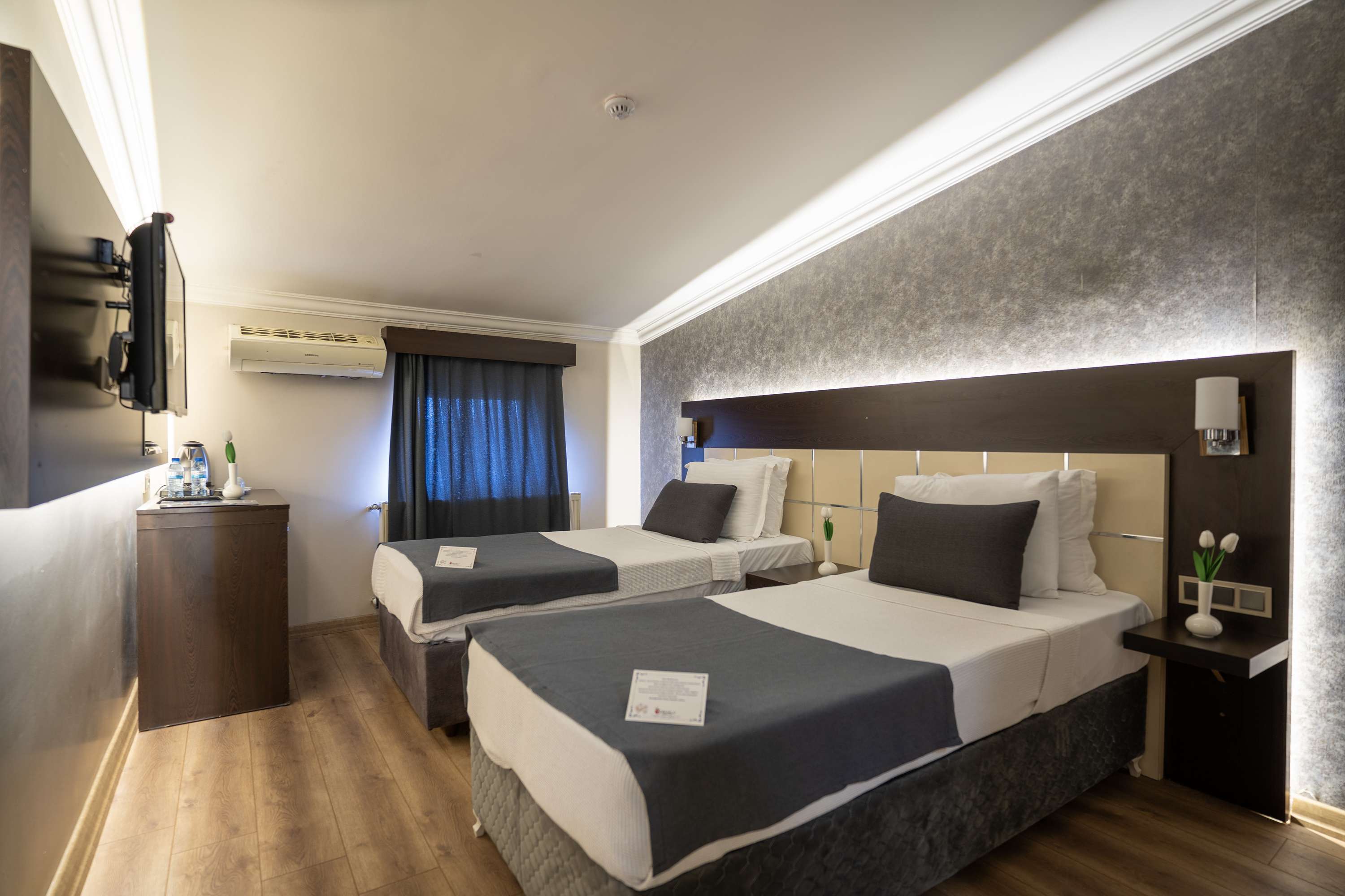 Garni Hotel Twin Room'da iki ayrı tek kişilik yatak, 24 saat sıcak su, TV, minibar, telefon, klima, ısıtma sistemi, güvenlik kasası ve ücretsiz Wi-Fi sunulmaktadır. Parke zeminli odamızın banyosunda WC, duşa kabin, saç kurutma makinesi, telefon, makyaj aynası ve buklet malzemeleri yer almaktadır.